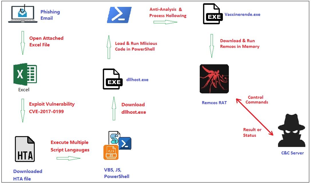 Fortinet's FortiGuard Labs recently noticed a phishing campaign in the wild. It is initialized with a phishing email containing a malicious Excel document. Upon researching the campaign, I found it was spreading a new variant of the Remcos RAT.