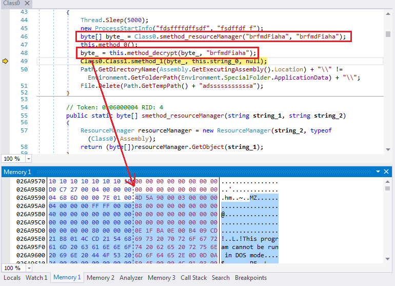 After sleeping for five seconds at the start of the Redline sample (Redline loader), it loads a data block from its .Net resource called "brfmdFiaha". This is then decrypted into a PE file with the key string "brfmdFiaha", as shown in Figure 1.3, where a local variable "byte_" is pointing to the decrypted PE file shown in the memory subtab.