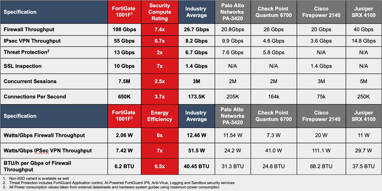 Just look at the Security Compute Rating chart comparing the performance and power consumption of competitor solutions versus our latest NGFW, the FortiGate 1000F, which showcases a 2 to 7.4x performance advantage and up to 7x lower power consumption: