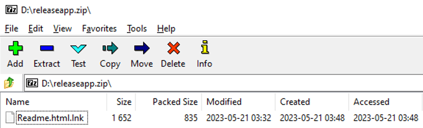 Furthermore, another malicious attack was hosted on a different domain called "releaseapp[.]zip," registered on May 21st. Visiting this site also leads to a zip archive. As expected, the contents are malicious.
