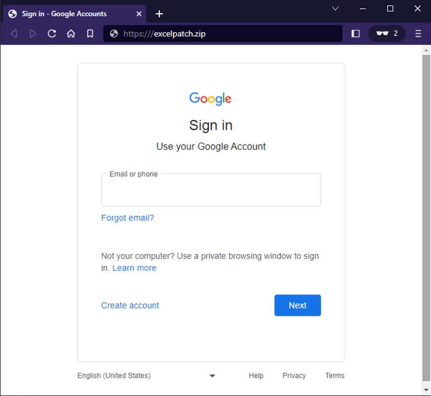 Not to be outdone, phishers also began creating their own pages. The domains "excelpatch[.]zip" and "outlook365update[.]zip" both looked like the following standard screen.