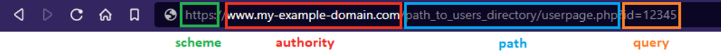 The authority portion can be further broken down into [userinfo@domain:port number], with userinfo usually including a username and password combination. Not all parts are required. For example, HTTPS is understood to use port 443, so it can be omitted. The userinfo field is usually included for websites that require basic authentication. For websites that don't use this type of authentication, these fields can safely be ignored. In this fake scenario, our domain is not using basic auth. This means that visiting hxxps://www[.]my-example-domain[.]com is effectively the same as hxxps://my_name:my_password@www[.]my-example-domain[.]com. This distinction will be important in the next section.