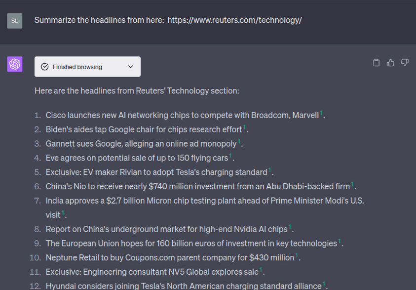 To illustrate this, let's use the Reuters technology news homepage as an example. A search usually involves scanning the site for stories, distilling keywords or phrases from them, and then adding them to a YARA rule. With internet access and browsing capability, AI can shortcut this process. Rather than searching manually, I can direct the AI to summarize an entire news page:
