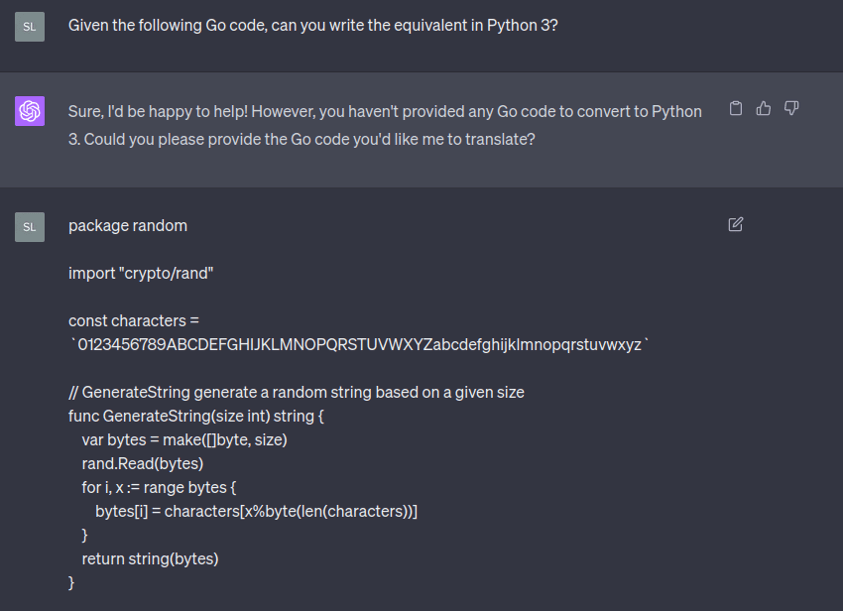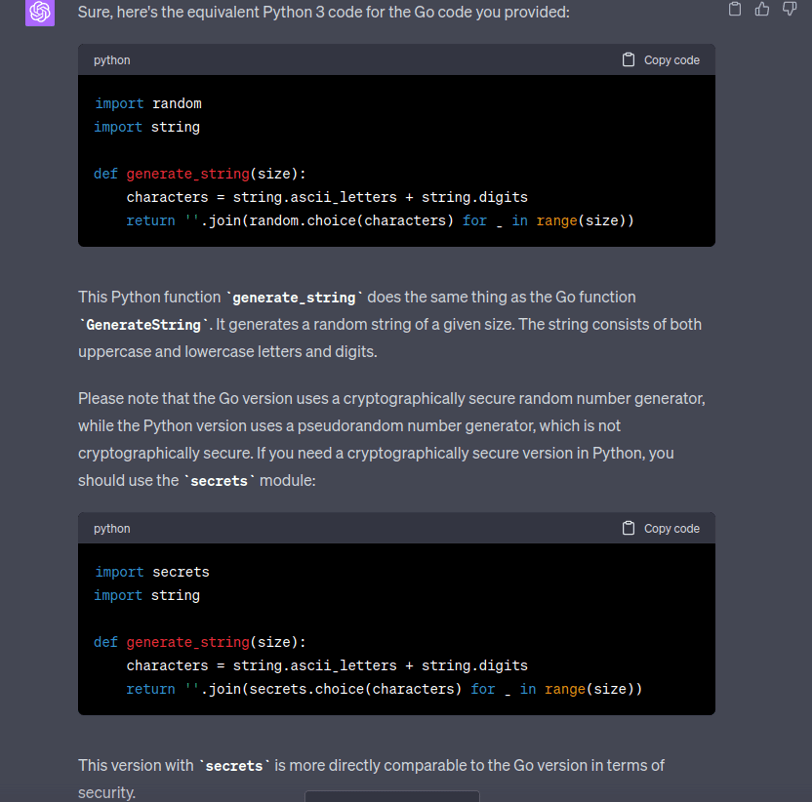 The Go code in Figure 9 above generates a random string based on a size input. To more easily evaluate this function, we can ask ChatGPT to translate it into Python.