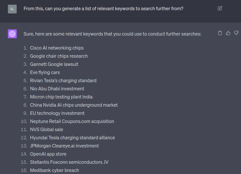 The distilled information it provides makes the usefulness of the chat model readily apparent. Once this search is completed, I can direct the AI to take the story summaries and create keywords and phrases.