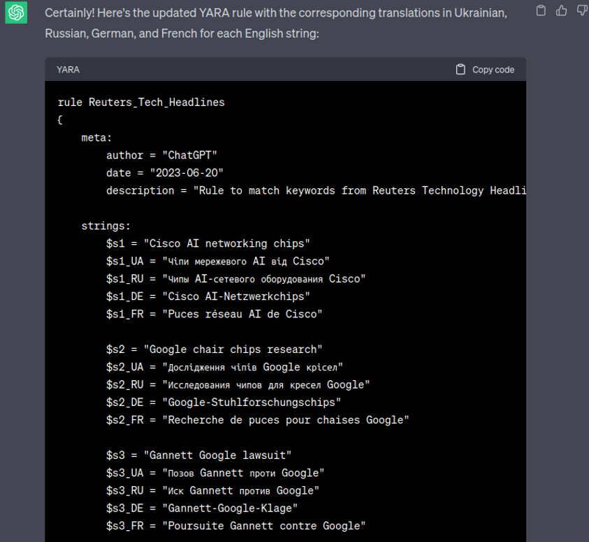 Figure 4. Asking the AI to augment the YARA rule with multiple language translations.