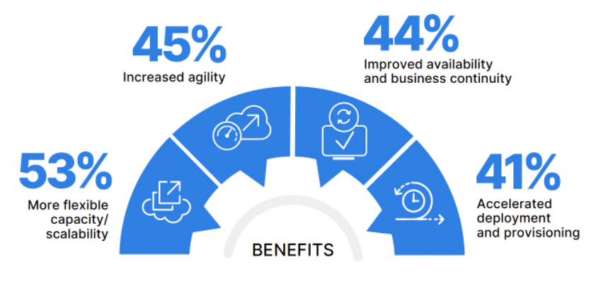 Public cloud computing continues to deliver many crucial benefits for businesses. Respondents agree that their respective organizations have experienced more flexibility and scalability (53%), increased agility (45%), improved availability and business continuity (44%), and accelerated deployment and provisioning (41%) because they have embraced the cloud. As a result, organizations are seeing improved business outcomes, such as increased responsiveness to customer needs.