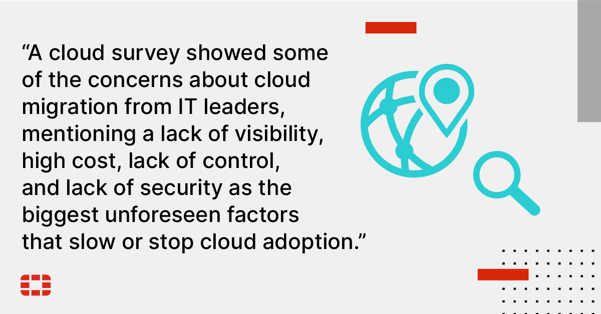 Recently, a cloud survey showed some of the concerns about cloud migration from IT leaders mentioning a lack of visibility, high cost, lack of control, and lack of security as the biggest unforeseen factors that slow or stop cloud adoption.