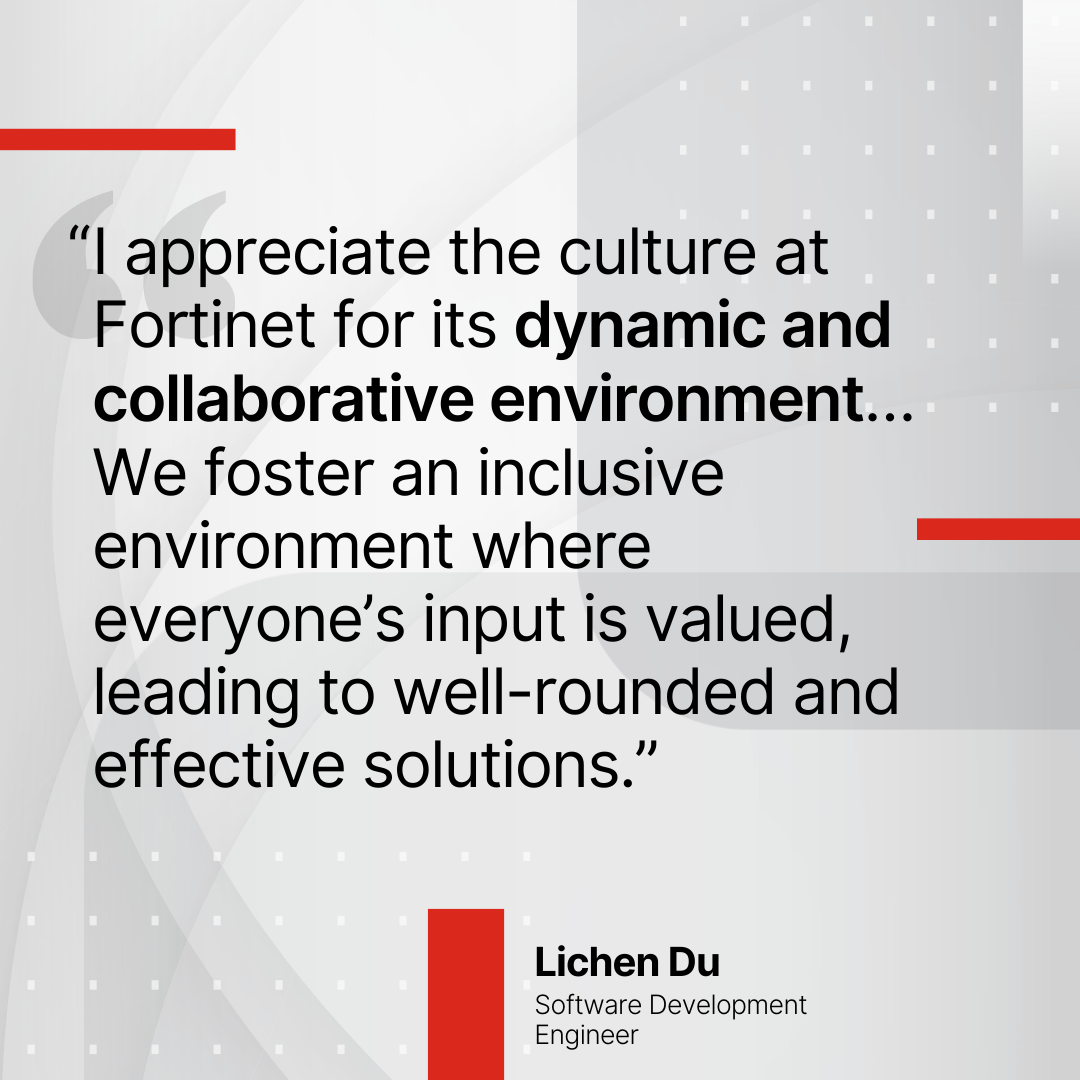 We recently interviewed, Lichen Du, who has been a Fortinet software development engineer for nearly two years. From our discussion, we learn why Lichen thinks Fortinet is a great place to work, how she feels about her role at the company, and what she believes is unique about the cybersecurity industry and the Fortinet culture, which is built upon three core values: teamwork, innovation, and openness.