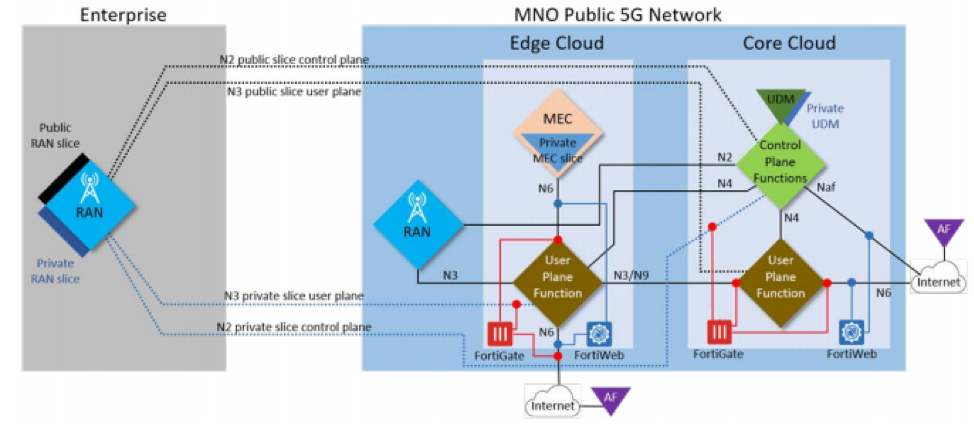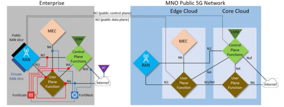 - MNO-Independent 5G (no sharing): On the right is the public 5G network. On the left is the private 5G network created specifically for an enterprise, such as an oil rig in the middle of the ocean that cannot connect to a public network or a car factory that wants complete control of their data. In this architecture, all Fortinet security applications occur on the enterprise's side.