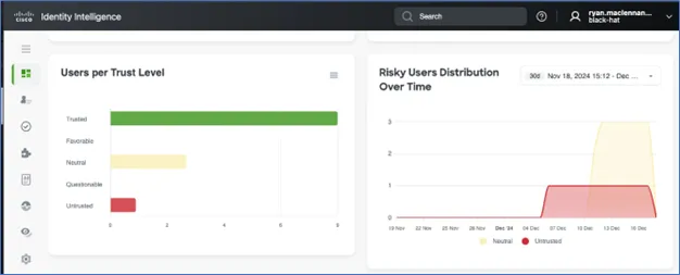 Cisco Identity intelligence (CII) is an AI-powered solution that bridges the gap between authentication and access. It allows us to bring in multiple authentication source logs into a single entity and then analyze them to determine if a user is trustworthy. CII will give a user a trust score based on geographic location, login times, Operating System (OS), device types, number of login attempts, correct and incorrect logins, device trust and many more criterion. CII takes all these indicators into account and then makes trust levels for each user. You can see our trust score spread in the below screenshot: