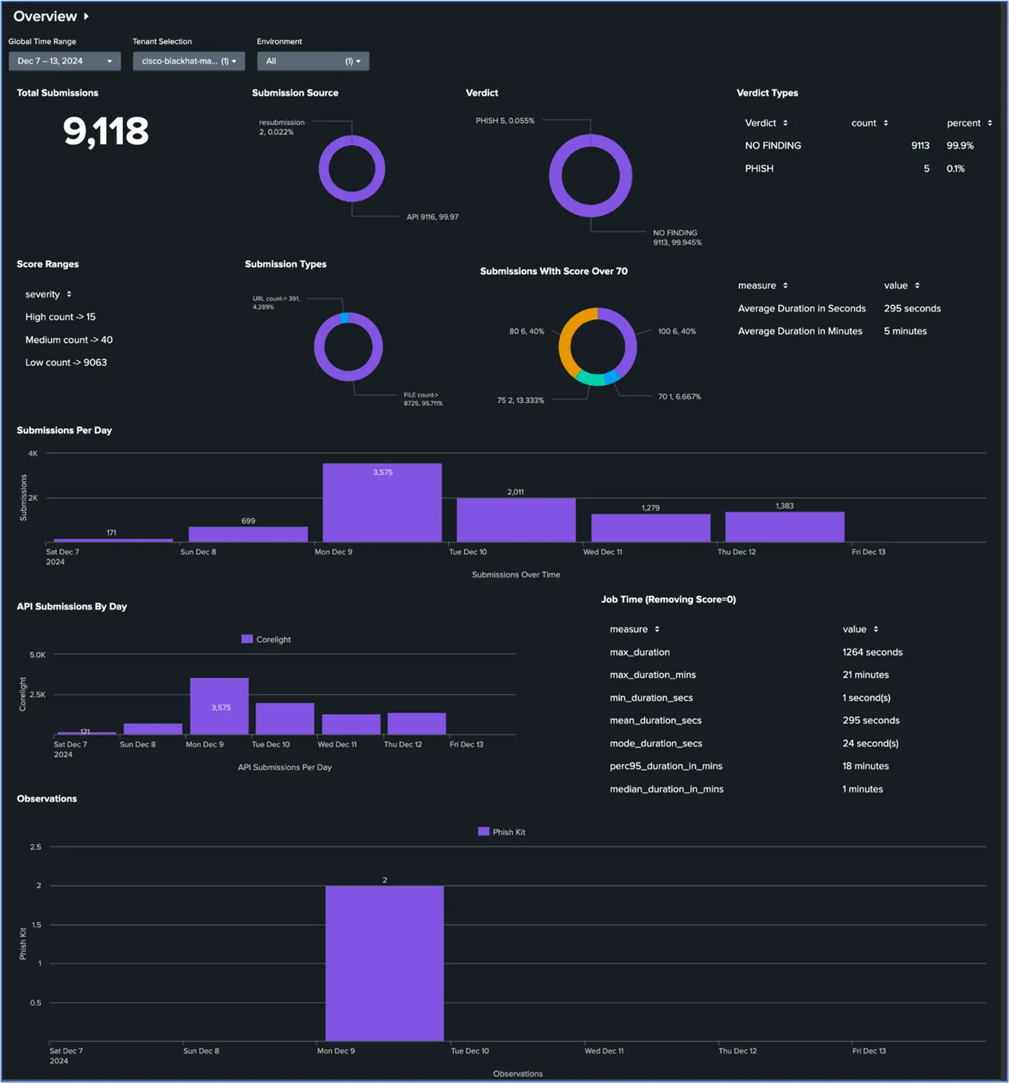 For Cisco, a core integrated function in the Black Hat NOC/SOC is providing the platform for our partners to send suspicious files to Secure Malware Analytics (aka Threat Grid) for dynamic malware analysis (aka sandboxing). We have expanded the integration over the years, with both Corelight OpenNDR and Palo Alto Networks Firewalls submitting samples. At Black Hat Europe 2024, over 12,000 supported samples were submitted.