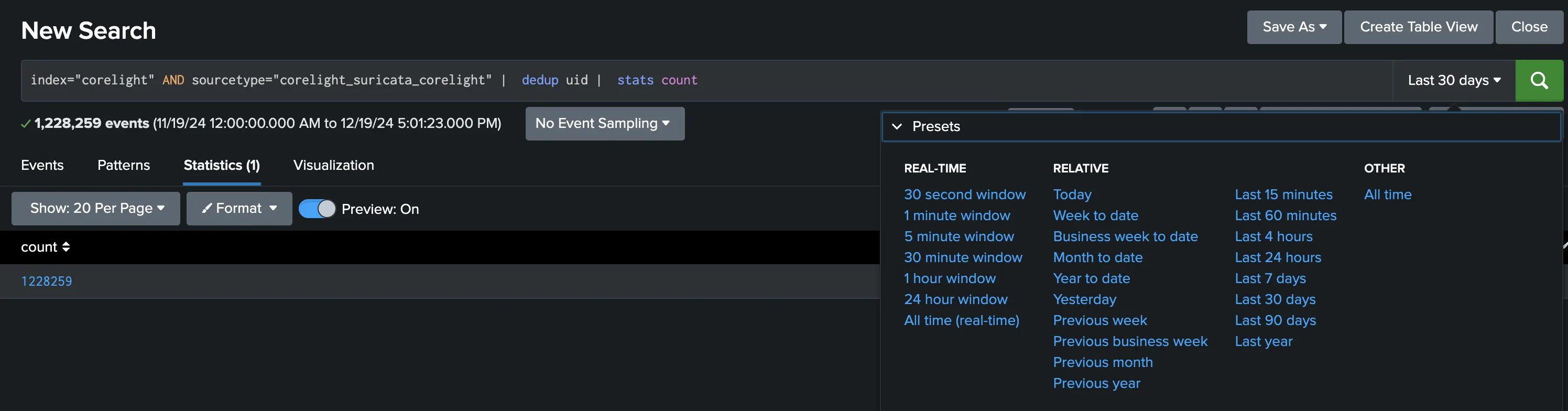We found our way through looking at the data and iterating. An example of a simple search for obtaining the count of all alerts from the Suricata engine of Corelight logs is below.