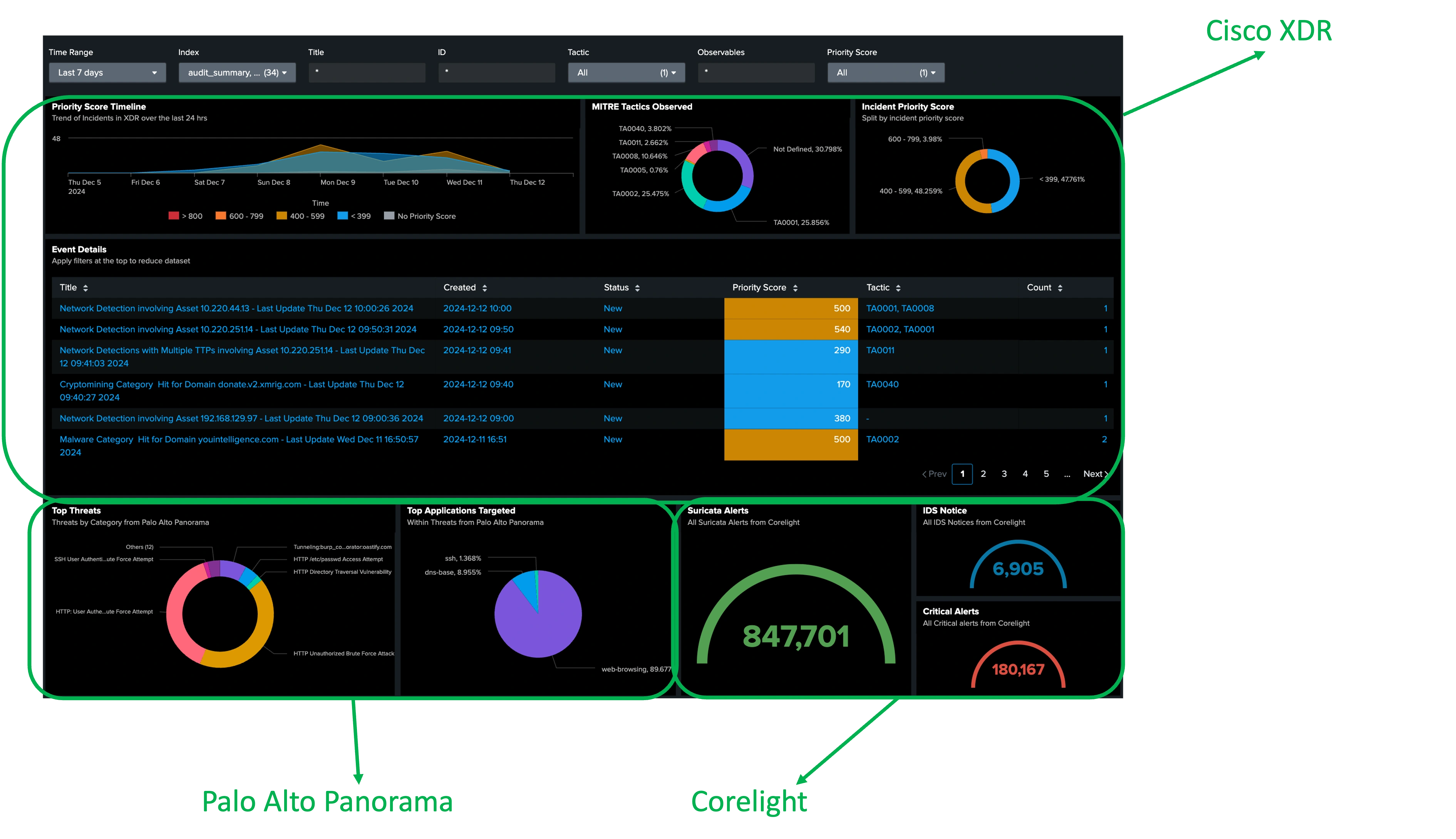 An example of some of these workflows in action together helped us hunt down a potential case of cryptomining in the NOC itself, during the early hours of Dec 12! Thanks to the Corelight and PANW firewalls integrations in XDR, we had ourselves a singular correlated incident, with detections from both partners.