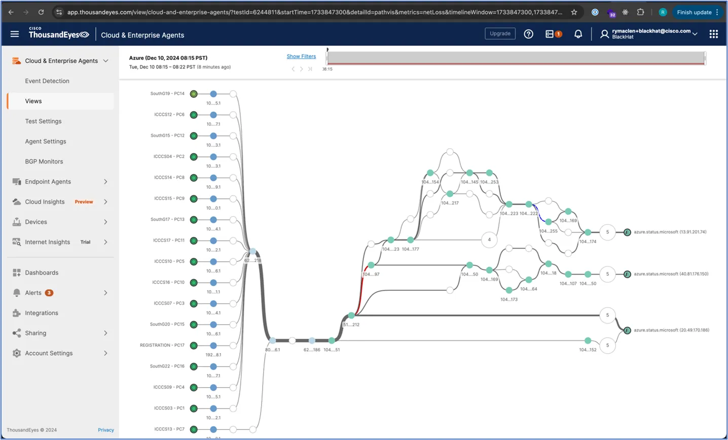 ThousandEyes is a very powerful tool, and it is able to determine whether the issue resides inside the network or outside where we cannot control it. Below is a screenshot of how many different network paths can take to a single resource. This shows the importance of being able to pinpoint exactly where an issue is taking place.