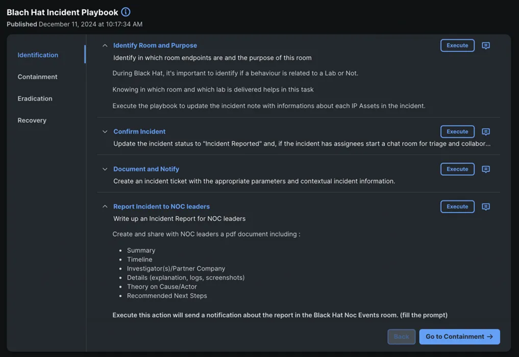 Next question -who is this 10.X.X.X device? And should they be cryptomining at Black Hat? Thanks to another automation workflow, with a click of a action of the Incident Response playbook we had attribution with physical room name and location within the event center from a pre-defined database for the identified asset in the incident. Response