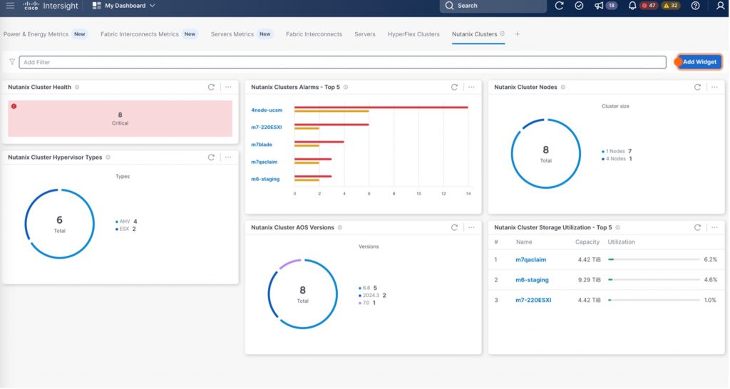 Because of Cisco Intersight and Nutanix Prism Central integration, IT teams have access to the Intersight unified dashboard to monitor Cisco HCI solutions running Nutanix software from multiple Prism Central apps. This unified dashboard enables centralized management, which can help reduce downtime, improve performance, and minimize security vulnerabilities.