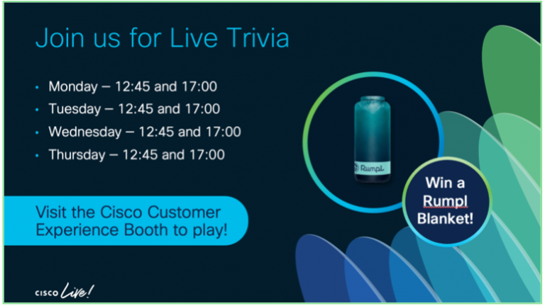 Live Trivia will be held at 12:45 p.m. and 17:00 p.m. Monday, February 10, through Thursday, February 13. You'll have the opportunity to take home a Rumpl Blanket and show off your knowledge of Cisco Customer Experience. Of course, you can attend our demos and sessions to learn more about Cisco Customer Experience and increase your chances of winning.