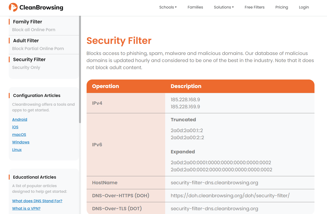 CleanBrowsing has three free public DNS server options: a security filter, adult filter, and family filter. These are the DNS servers for the security filter, the most basic of the three that updates hourly to block malware and phishing sites: