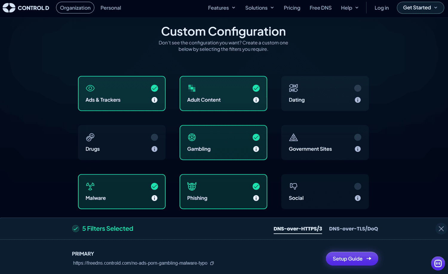 Something unique about Control D that I love to see is the custom configurations. For example, I could join trackers and ads, malware, phishing, and government sites to make a custom filter to block all of that content. Premium filters are available for a low cost that can block things like crypto exchanges and VPNs. Control D also supports DoH and DoT.