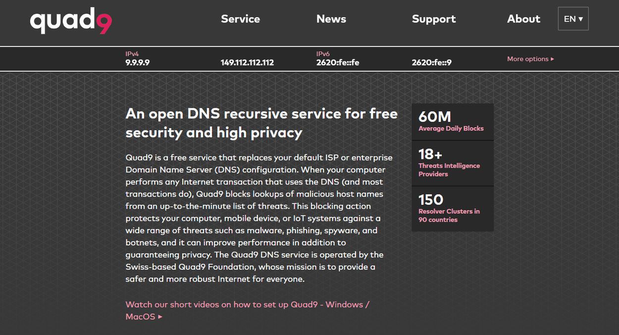 Quad9 has free public DNS servers that protect your computer and other devices from cyber threats by immediately and automatically blocking access to unsafe websites. One thing I appreciated while researching this company is that it works without storing your personal data; their website clearly states that when you use Quad9, "no data containing your IP address is ever logged."