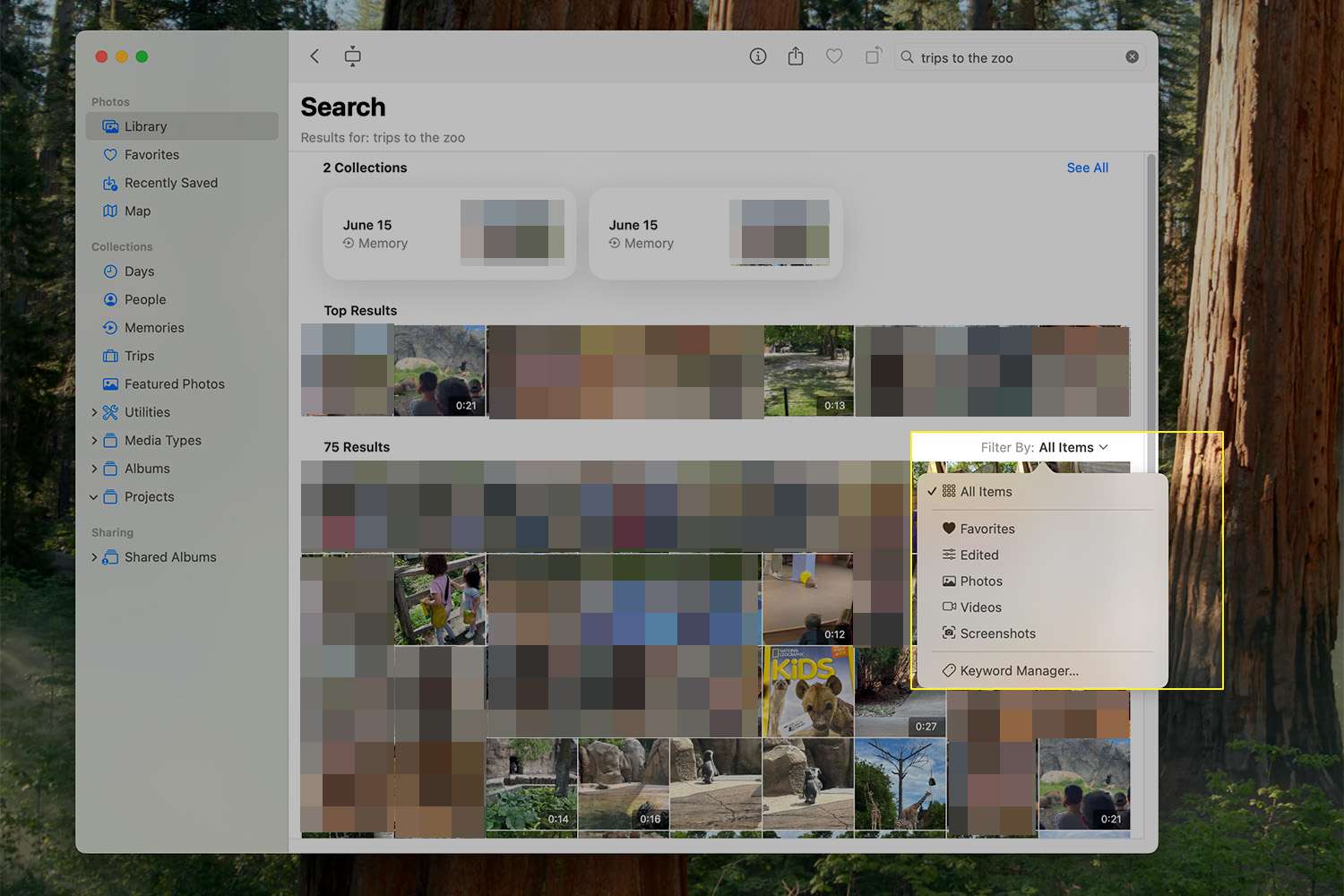 To filter the results on a Mac, use the Filter By drop-down menu to filter by photos, videos, edited items, and more.