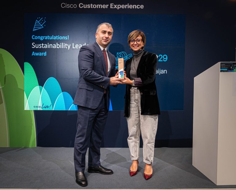Elnar Asadov accepts the award for Sustainability Leader from Adele Trombetta, SVP & GM, CX EMEA, Cisco.