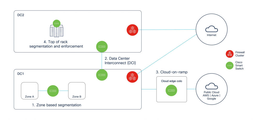 - Secure Data center interconnect (DCI): By converging border gateways and Layer-4 firewalls, Cisco Smart Switches reduce costs, enhance efficiency, and enforce consistent security policies across interconnected data centers.