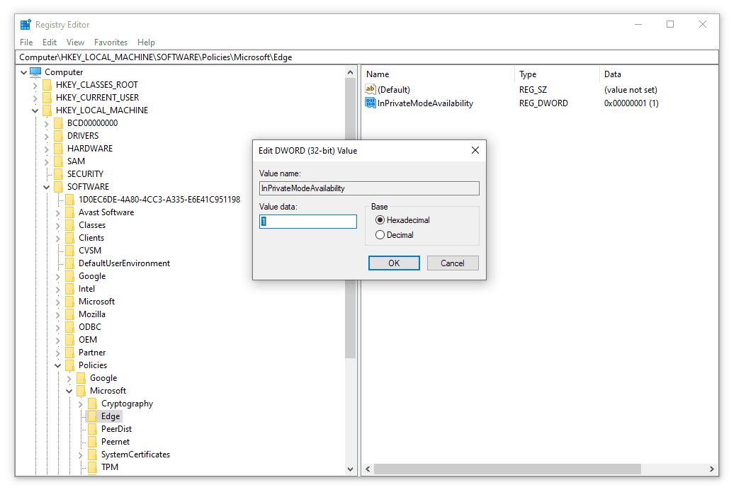 Select OK, close Registry Editor, and then reboot your computer. You've now turned off Edge's InPrivate option.