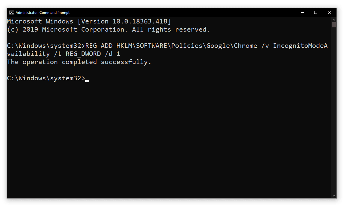 REG ADD HKLM\SOFTWARE\Policies\Google\Chrome /v IncognitoModeAvailability /t REG_DWORD /d 1 -