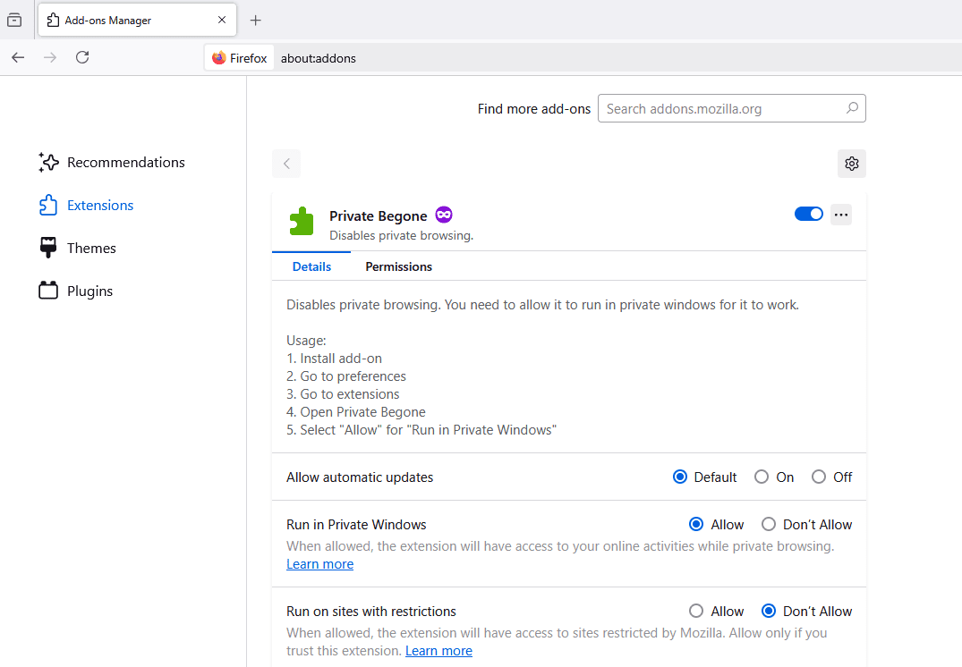 Select Allow next to Run in Private Windows. Private Browsing is now blocked from opening.