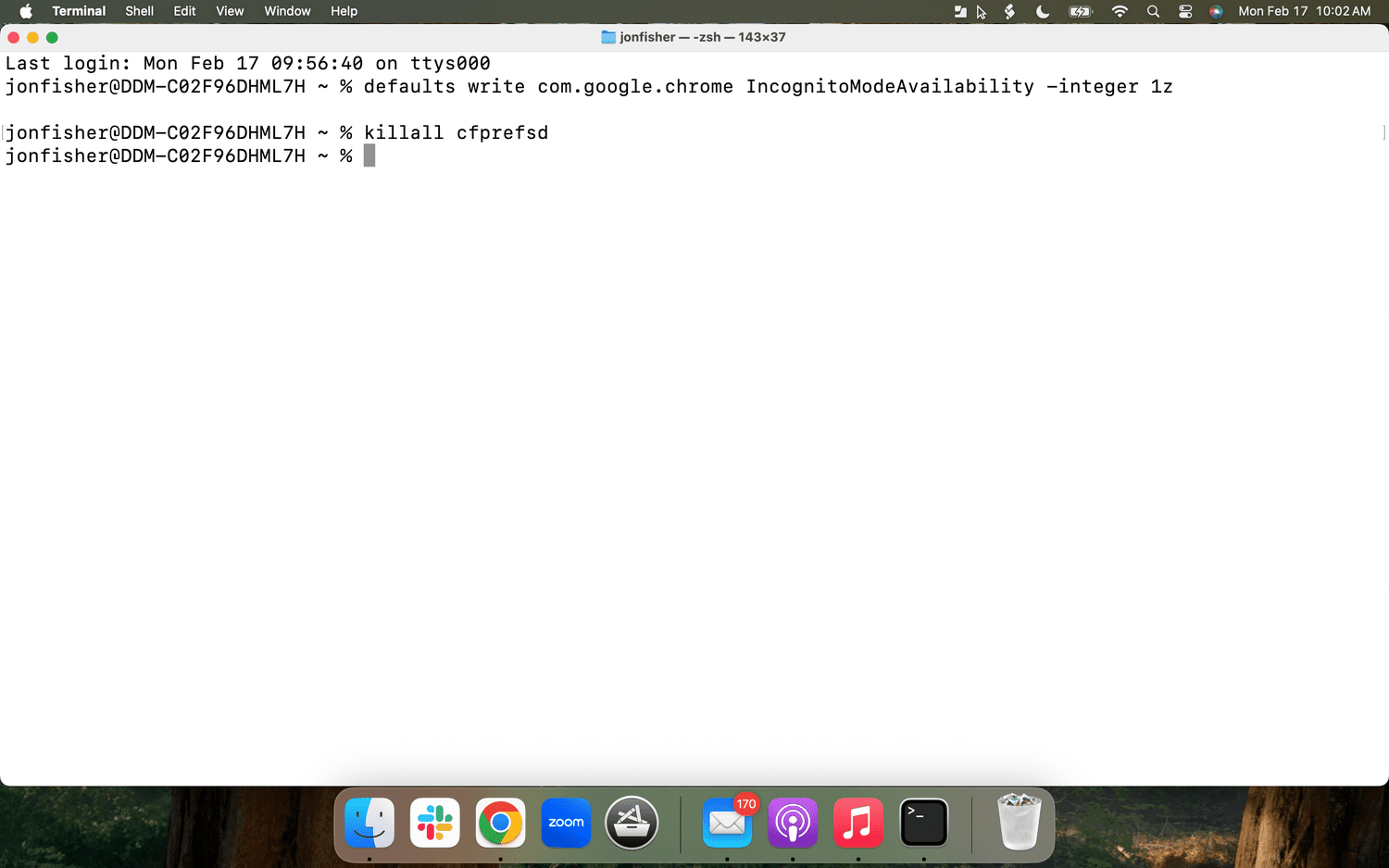 defaults write com.google.chrome IncognitoModeAvailability -integer 1z -