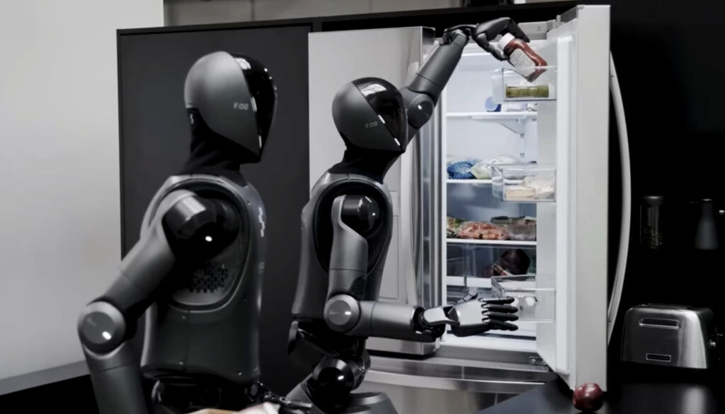 One clip shows two robots collaborating to put away groceries, while another captures a group sorting packages on an assembly line. Both demonstrations highlight the capabilities of the company's Helix AI, which enables the robots to understand commands and interact with their environment.