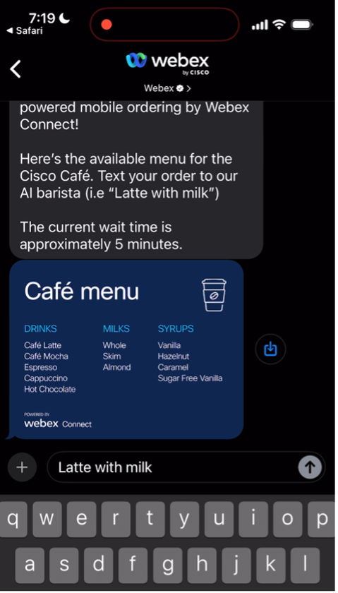 AI was on full display inside Cisco's booth as our mobile engagement demo highlighted Webex Connect's ability to redefine the purchase journey with intelligent automation. Mobile coffee ordering met attendees in the Cisco booth, highlighting an experience beginning with AI-driven self-service and finishing with some of the best lattes on the show floor.