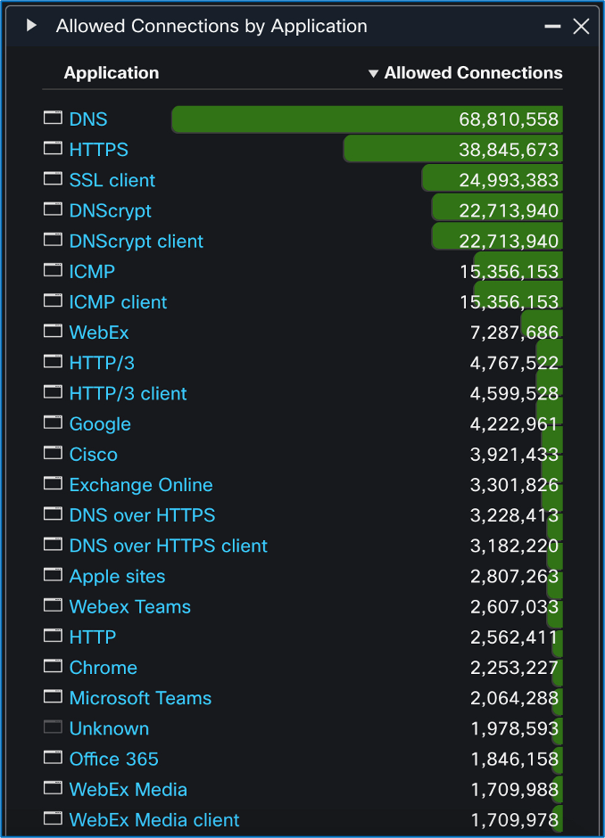 Application data is another area that we monitor at a broad level, in addition to individual alerts for malicious domains. We continue to see plaintext attacks and plaintext information leaks at each conference, but the frequency of these has gradually decreased. At Cisco Live Melbourne 2024, we saw a 15:1 preference for HTTPS over HTTP. HTTP/3 also continues to grow in popularity.