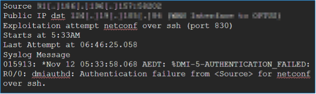 It all started with Adam seeing a bunch of SSH connections from an IP in the DC static host group range to some internal IPs on a non-standard port (TCP 830). Prima facie, all those connections were successful, so it appeared legitimate.