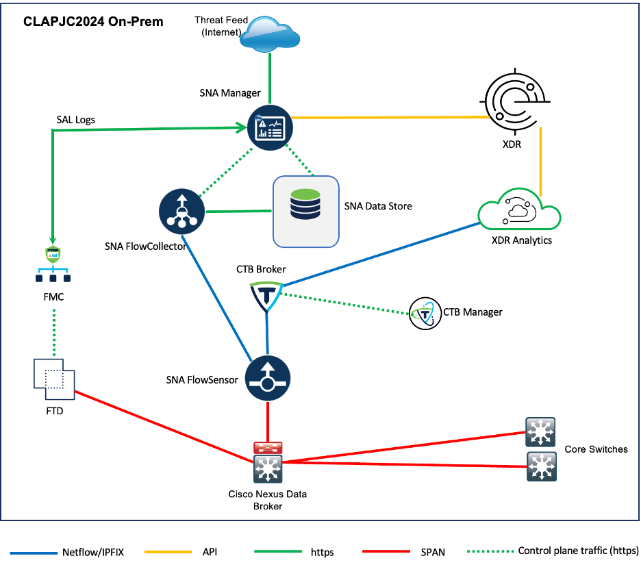 On the bottom right, we have Secure Client deployed on Windows machines around the conference to send NVM and EDR data to XDR and Secure Endpoint. Lastly, we have all the products in the orange dotted box sending data to XDR along with third-party threat intelligence feeds.
