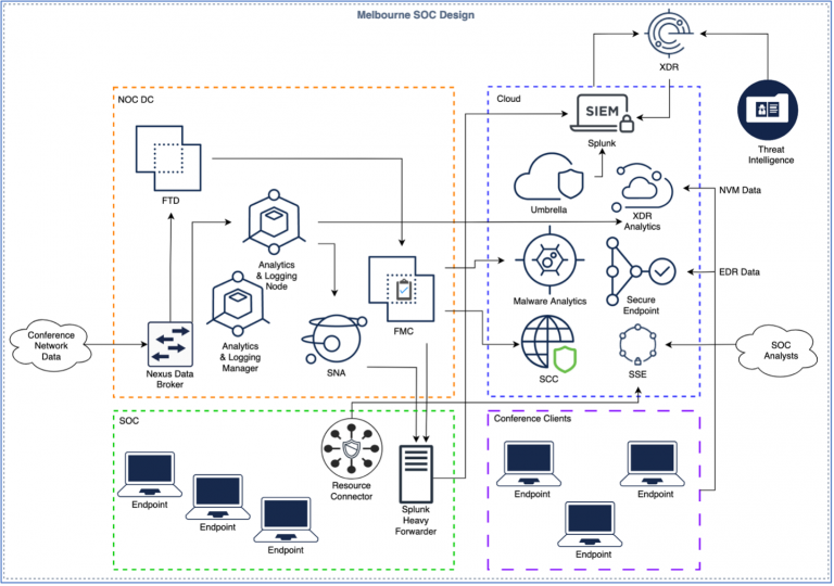 Cisco XDR and Splunk ES are integrated together and receive relevant data from all conference infra. Specifically, the following products were deployed to provide relevant data: