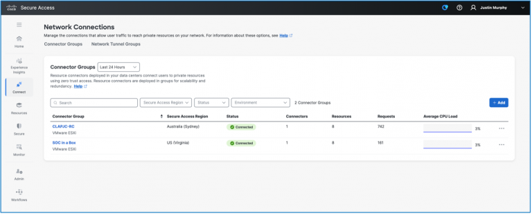 To the right of the NOC DC, we have our cloud-based products. Under the NOC DC there is a green box with the SOC analysts in it. This is not only where we sit but also where we connect to our internal resources using Secure Access. We used the Secure Access Resource Connector to connect to internal resources like the Firewall Management Center (FMC) and Secure Network Analytics (SNA). This is further explored in the next section of the blog.