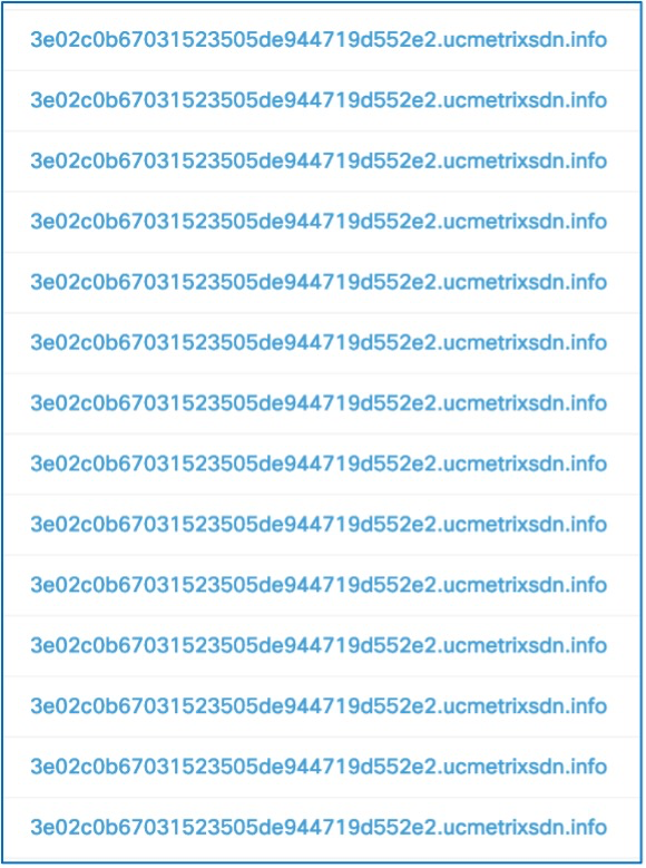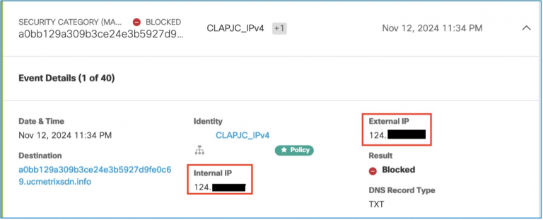 A couple days into the conference we noticed several block events in Umbrella DNS. The events were TXT record queries for what appeared to be randomly generated subdomains belonging to ucmetrixsdn[.]info. The queries resemble the domain generation algorithm (DGA) technique commonly deployed for malware beaconing.