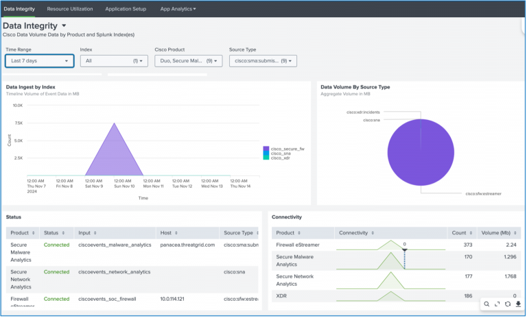 The Cisco Security Cloud app, which is published on the Splunk base app store, is a single app to get data from Cisco Security tools into Splunk. The app is modular so individual products can be configured to ingest data into Splunk including Secure Malware Analytics, Firewall, Secure Network Analytics, Cisco XDR and more. The app includes a pre-configured dashboard for each product and health monitoring of the app to see how much data is being ingested. When data is ingested, the app transforms the data to a Common Information Model (CIM) which is Splunk's universal schema for indexing data. This allows us to create visualizations across multiple data sets or search for a single field across multiple telemetry types.