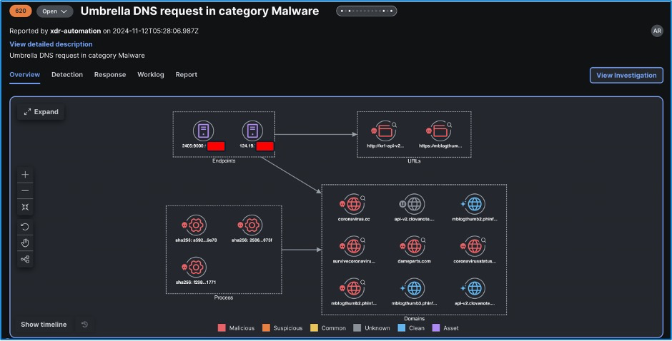Any DNS Security Events in Umbrella for certain categories of interest would be brought forward to the analyst as an incident per category. This shows an example of an automation created incident for the Malware category.