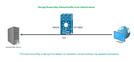 | Decrypt -Known Key | Decrypts inbound traffic using a known private key for internal servers, inspects it, and forwards it to the server. | Used for inspecting traffic to internal servers with known keys. |