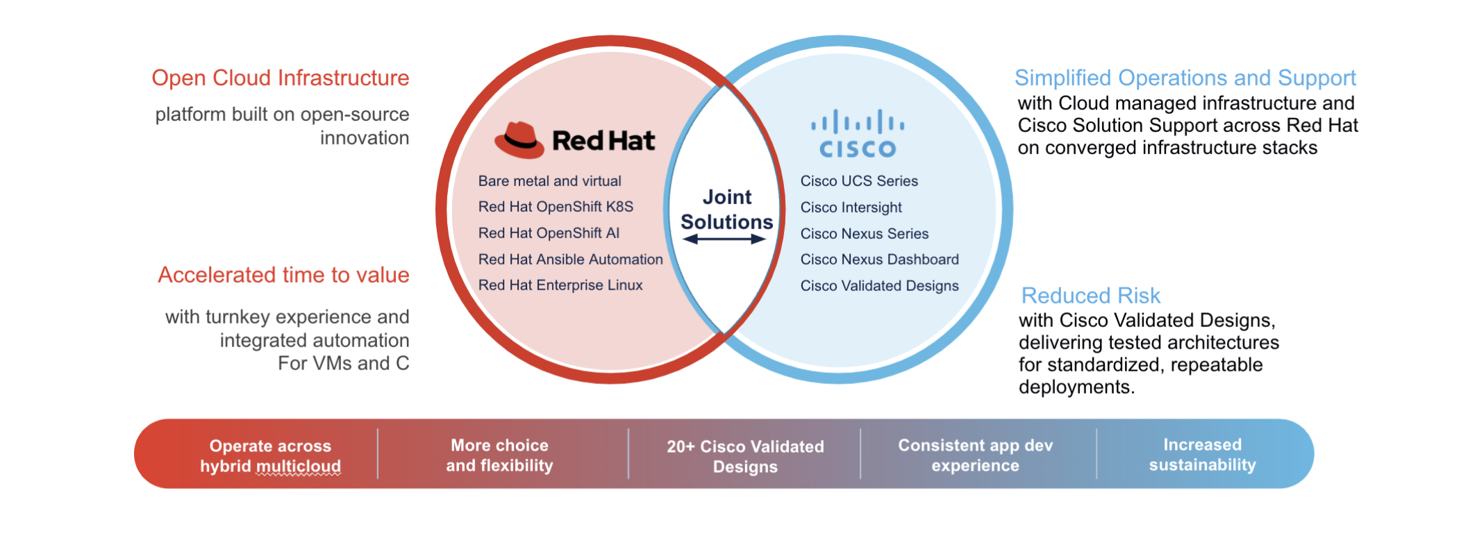 The partnership between Cisco and Red Hat has been longstanding. Last year we announced our companies are helping customers adapt to infrastructure modernization requirements by building integrated solutions that include Cisco UCS, Cisco Intersight, Cisco data center networking, and Red Hat OpenShift. These solutions unite best-in-class technologies from Cisco and our partners.