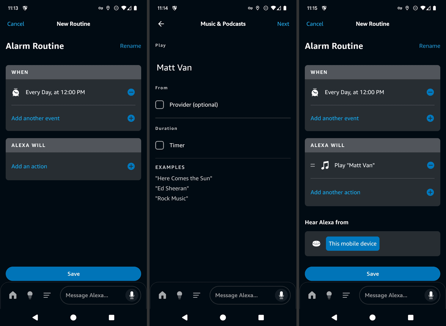 Maybe you're away from your Amazon speaker or simply want an alternative to the above. Rather than using the Alarm feature, you can set up an Alexa Routine to play what you want, when you want.