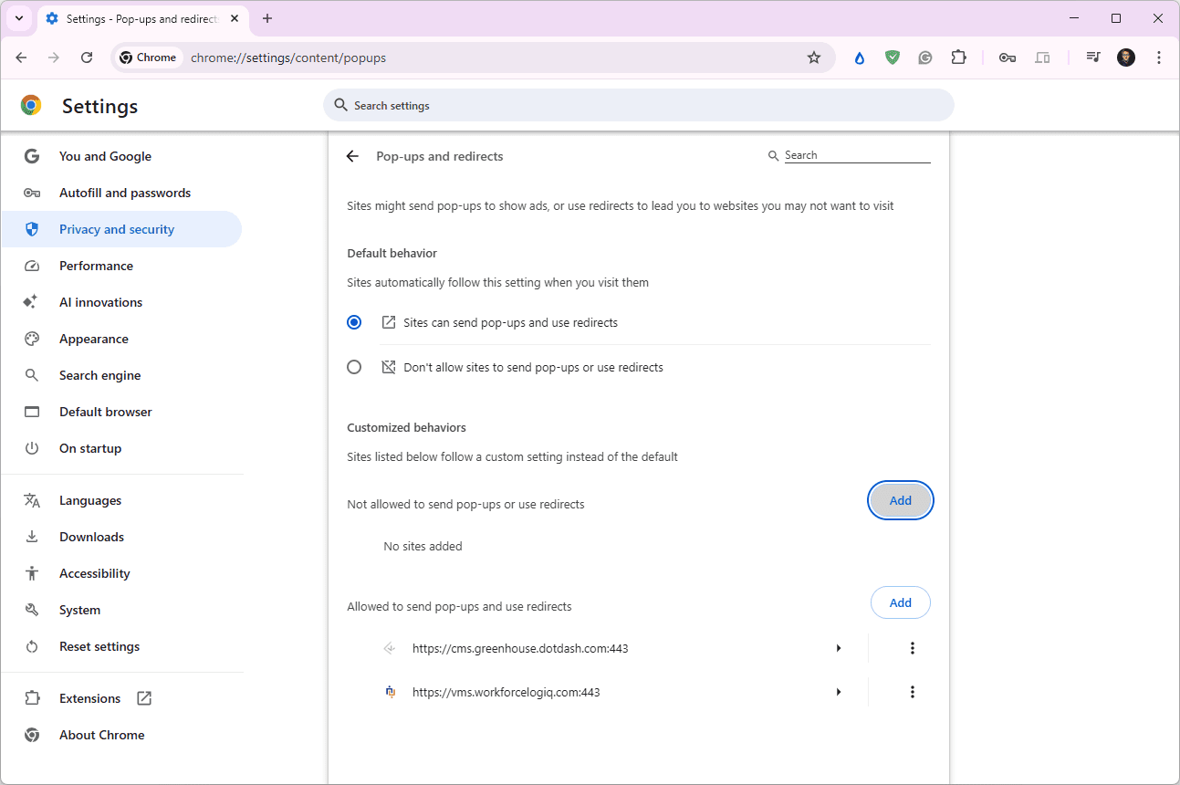 To allow pop-ups from a certain site, select the Add button next to Allowed to send pop-ups and use redirects.