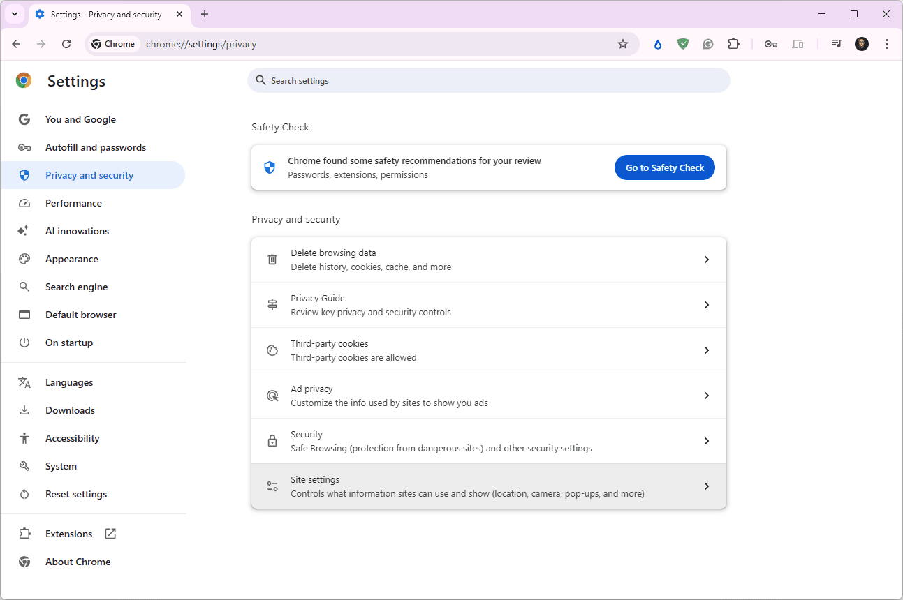 Select Privacy and security on the left, and then Site settings on the right.