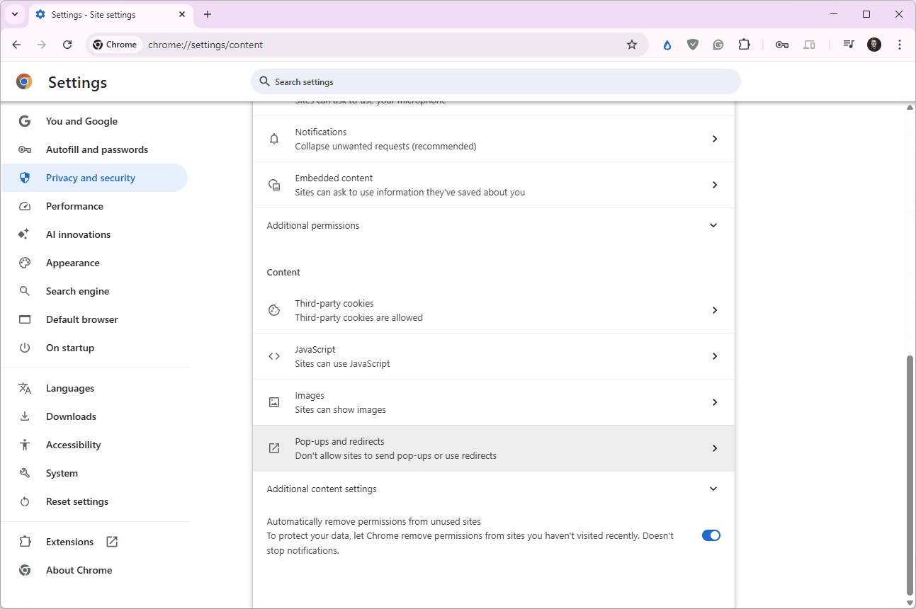 - Open Chrome's settings and select Privacy and security > Site settings > Pop-ups and redirects.