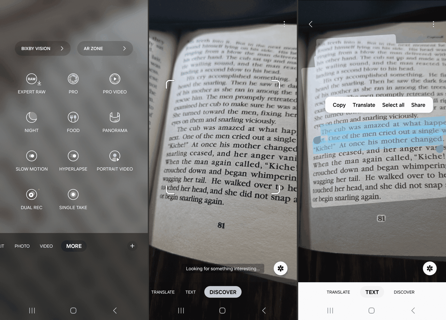 Bixby Vision works like a scanner and Optical Character Recognition software. Point the camera at some text and then tap Text at the bottom. Bixby Vision will let you highlight the text it finds so that you can copy, translate, or share it.